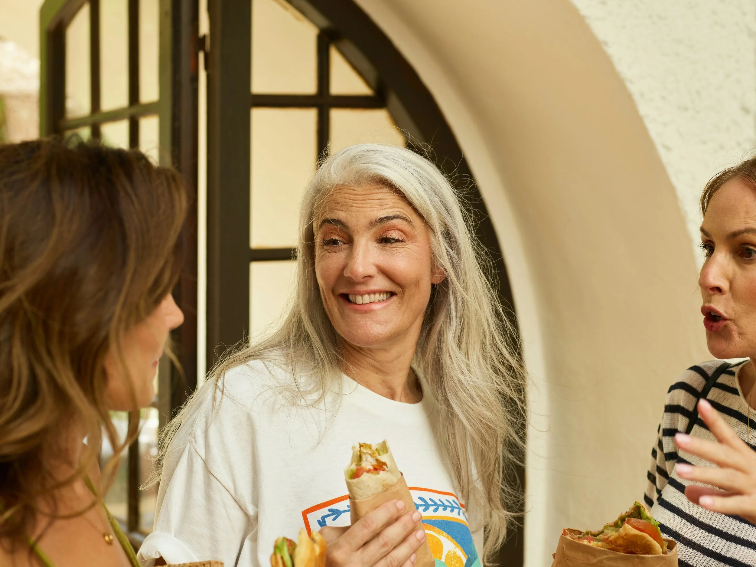 Three women enjoying lunch together at a café, smiling and chatting. The woman in the centre has long silver hair and holds a wrap, flanked by two friends in casual clothing.
